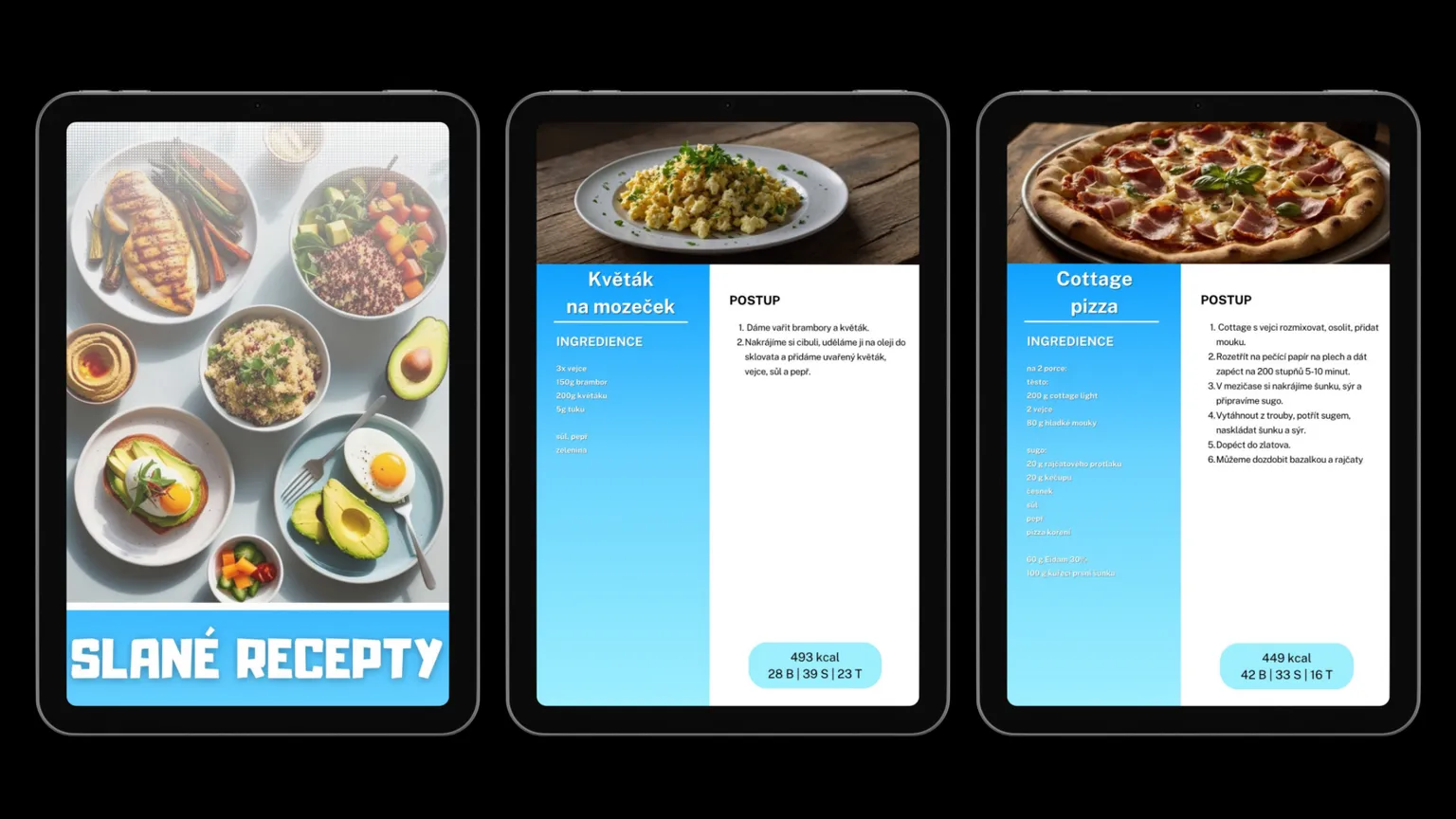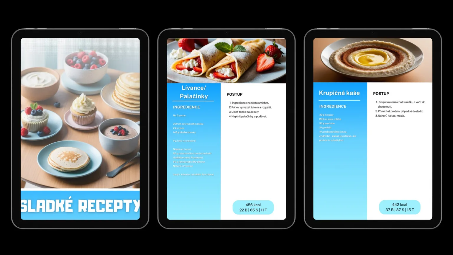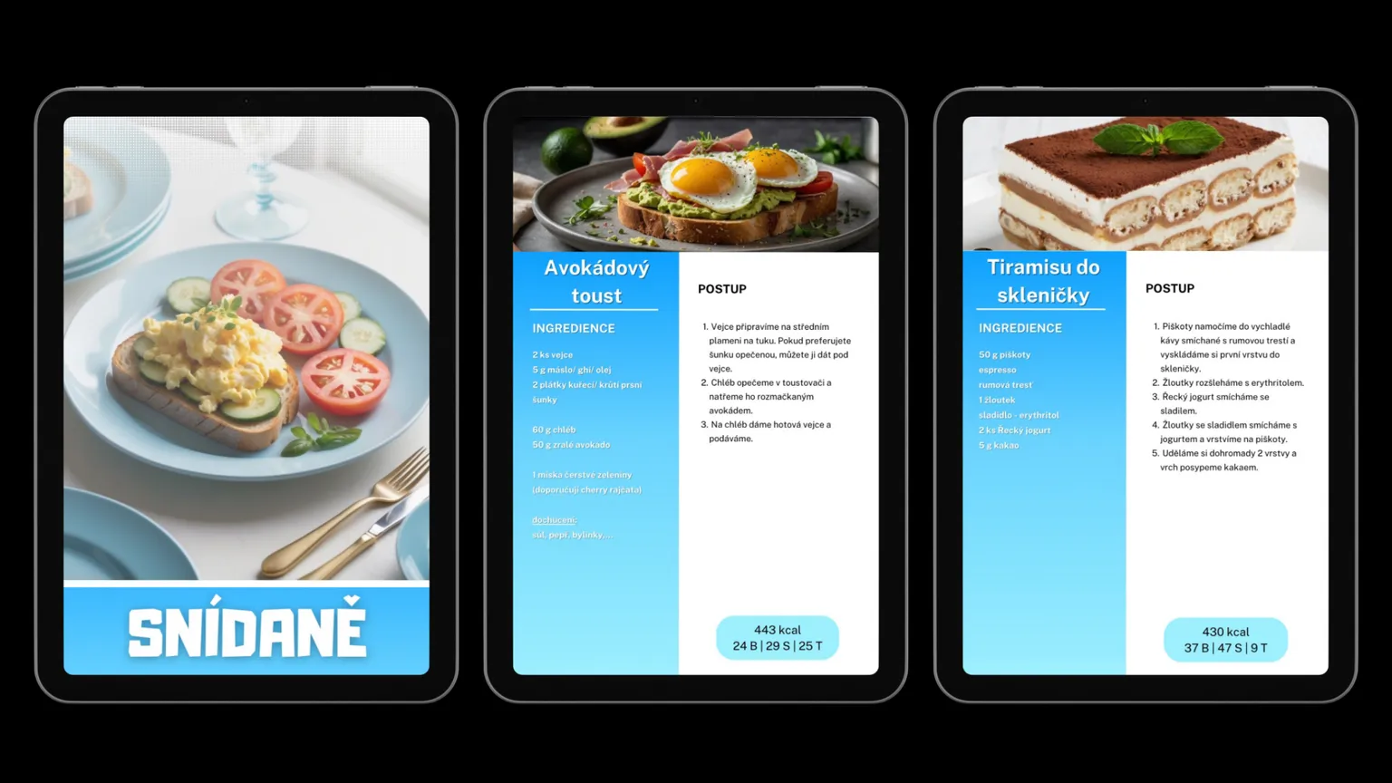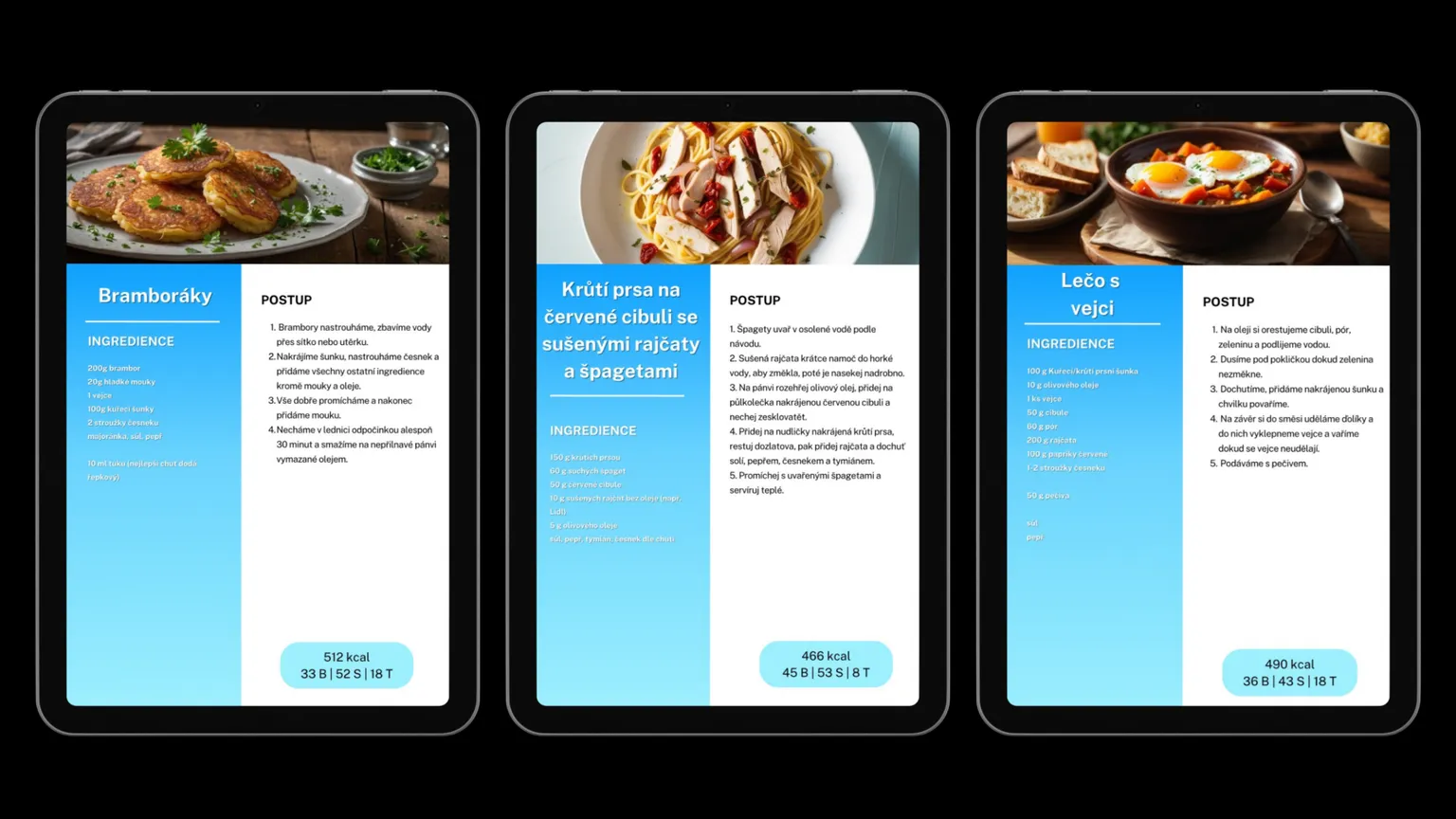 ✅ 100+ receptů s výživovými hodnotami (kcal, bílkoviny, tuky, sacharidy)